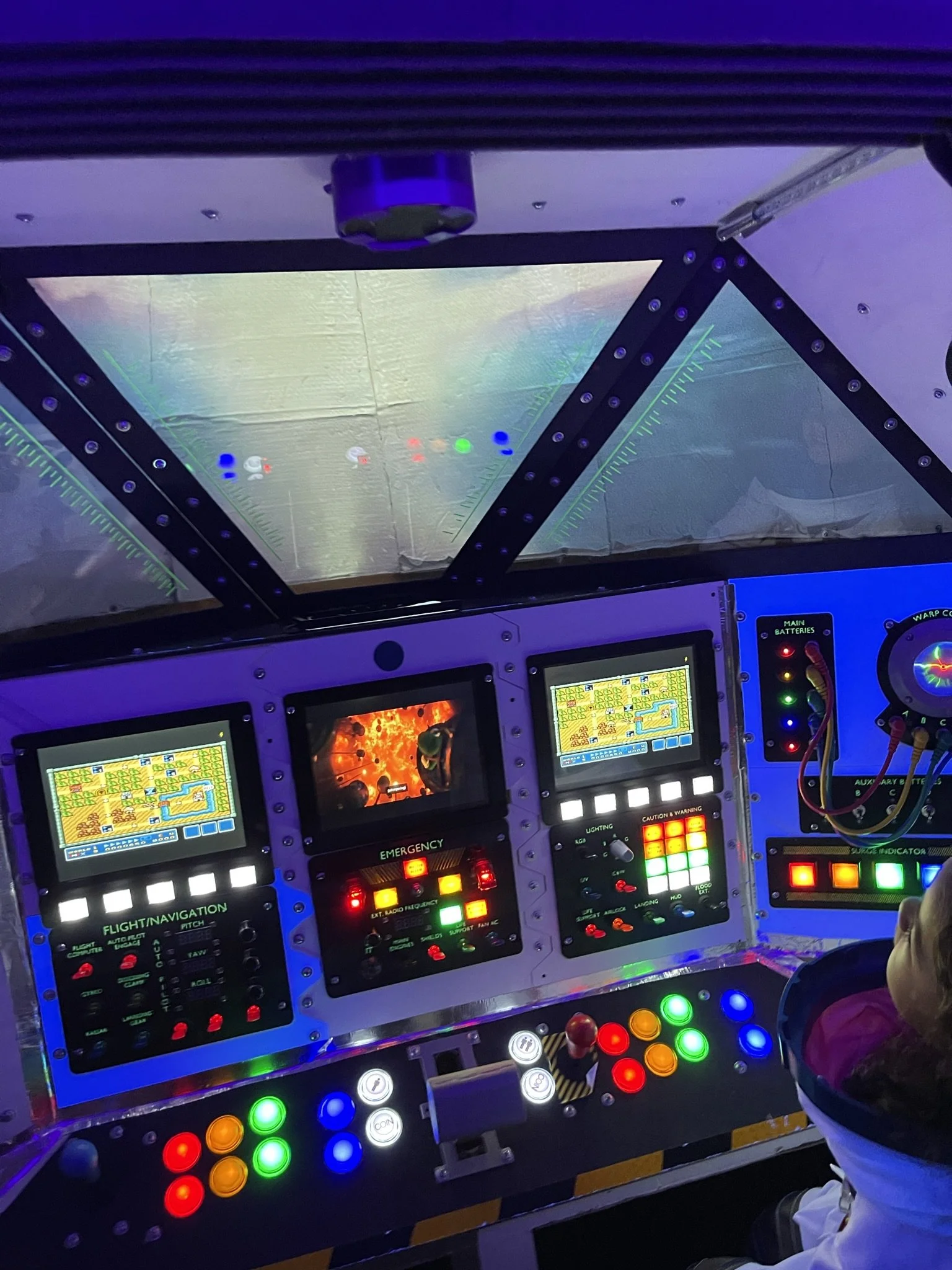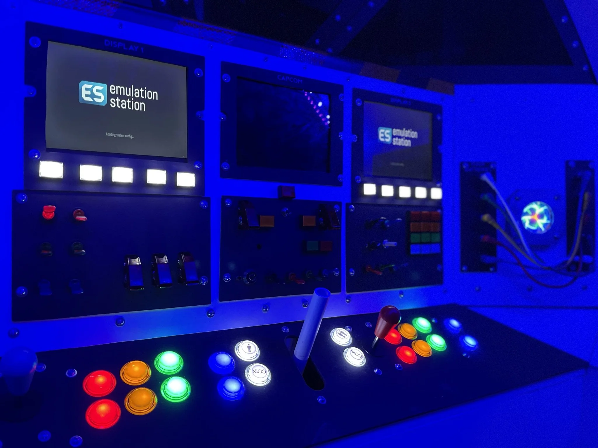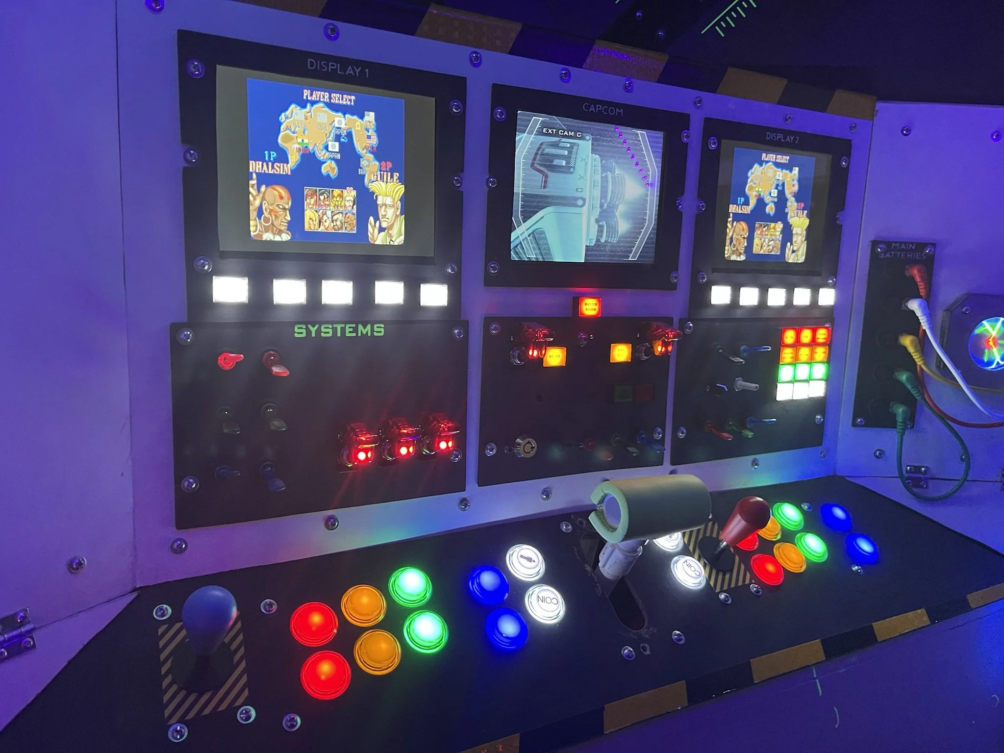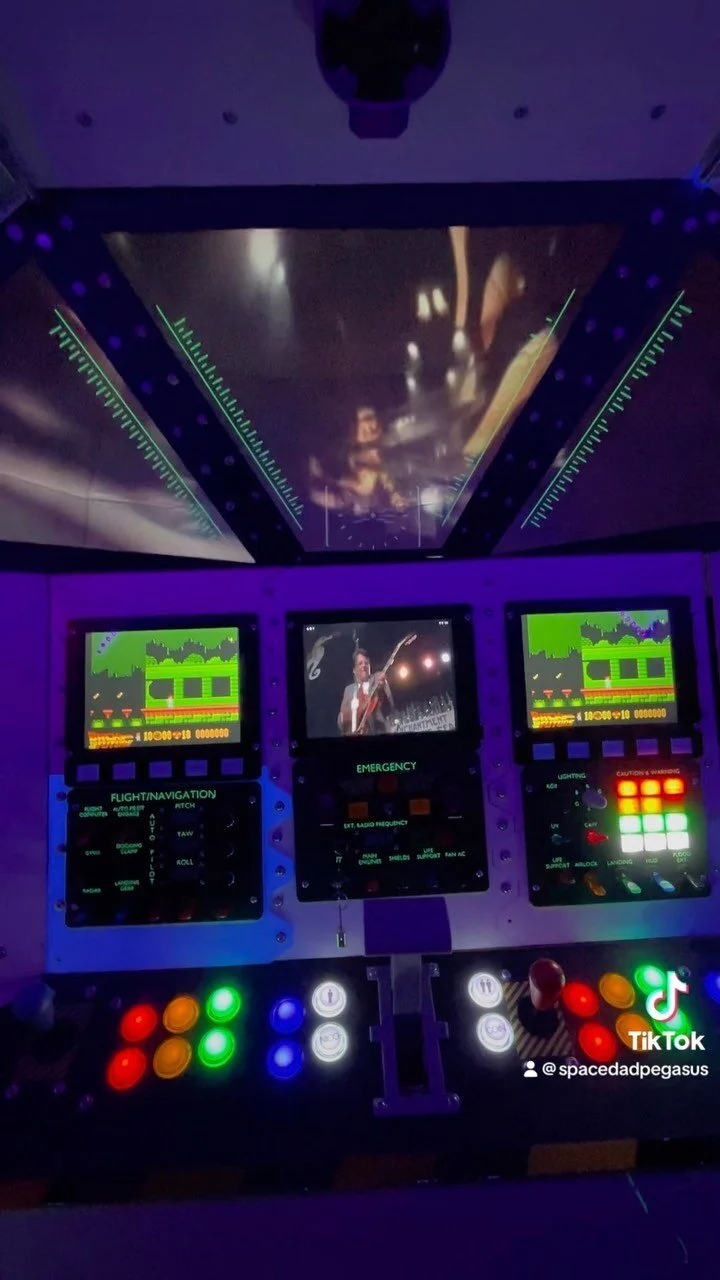 At first, I just wanted lights and switches that clicked and glowed. But when I stumbled across a Raspberry Pi setup loaded with (totally legitimate, definitely not bootleg) retro arcade games, the mission changed. With 3 relatively inexpensive 8” LCDs wired through an HDMI splitter, the ship became not only a cockpit but also a time machine into my own childhood.