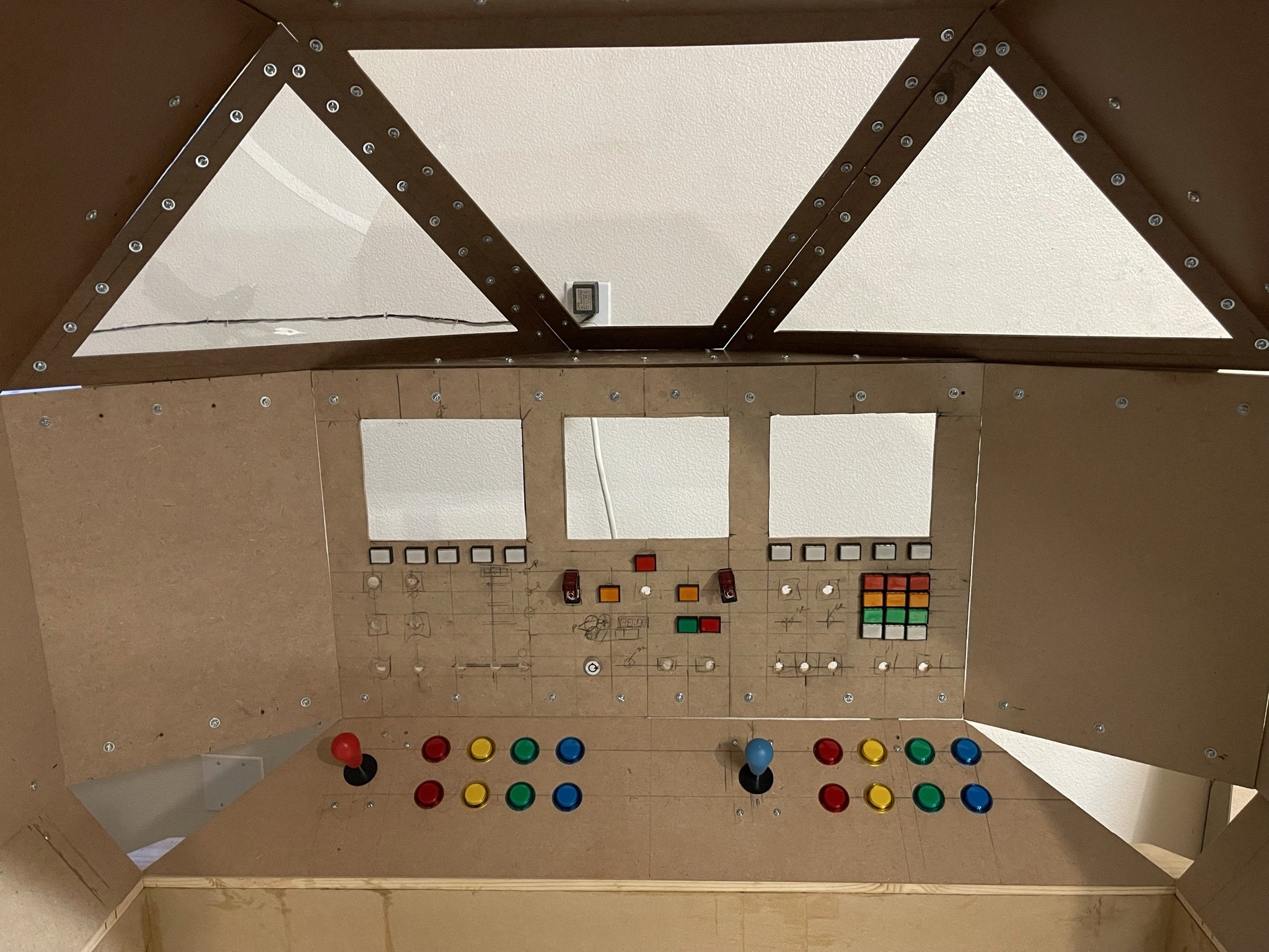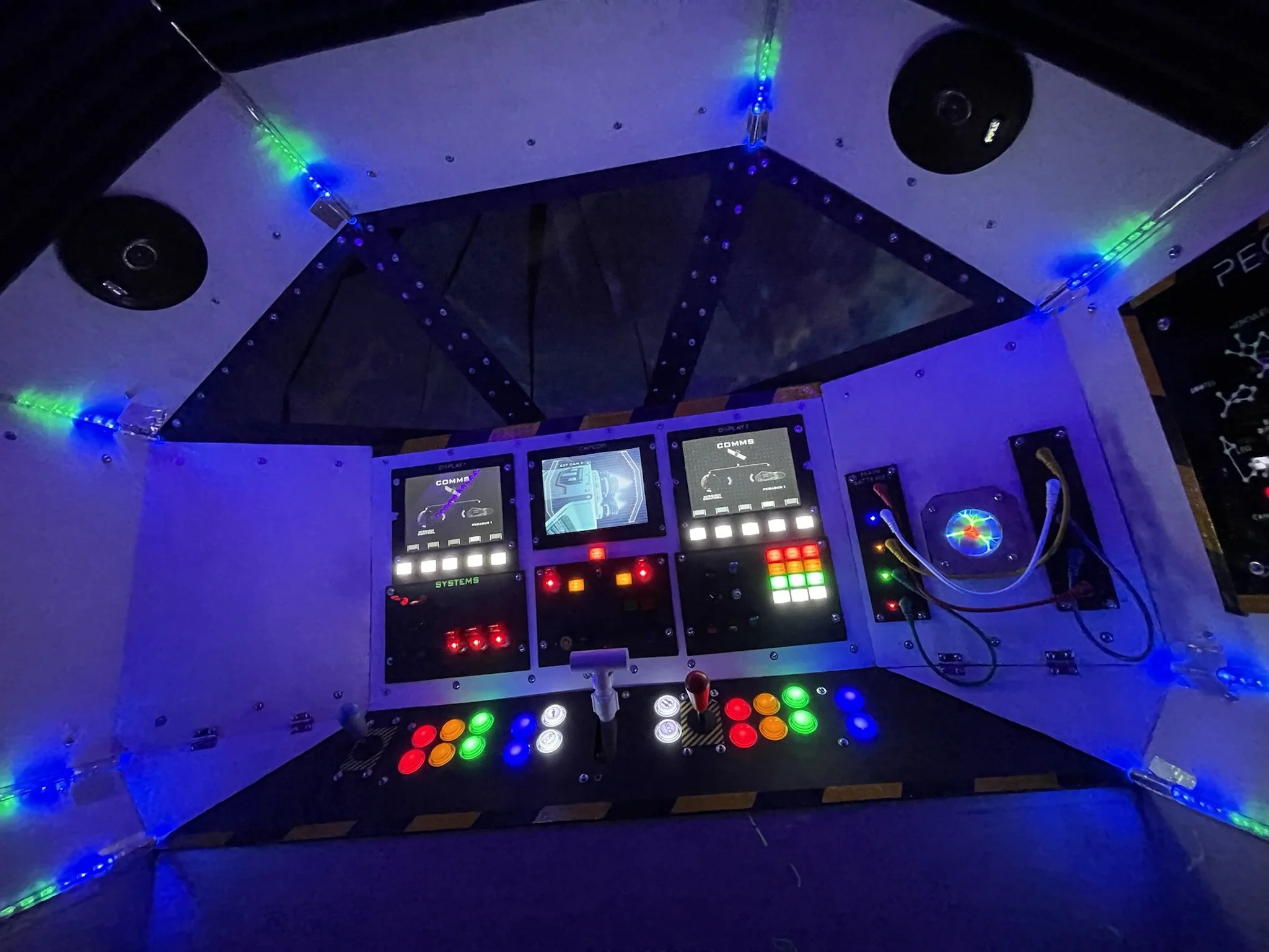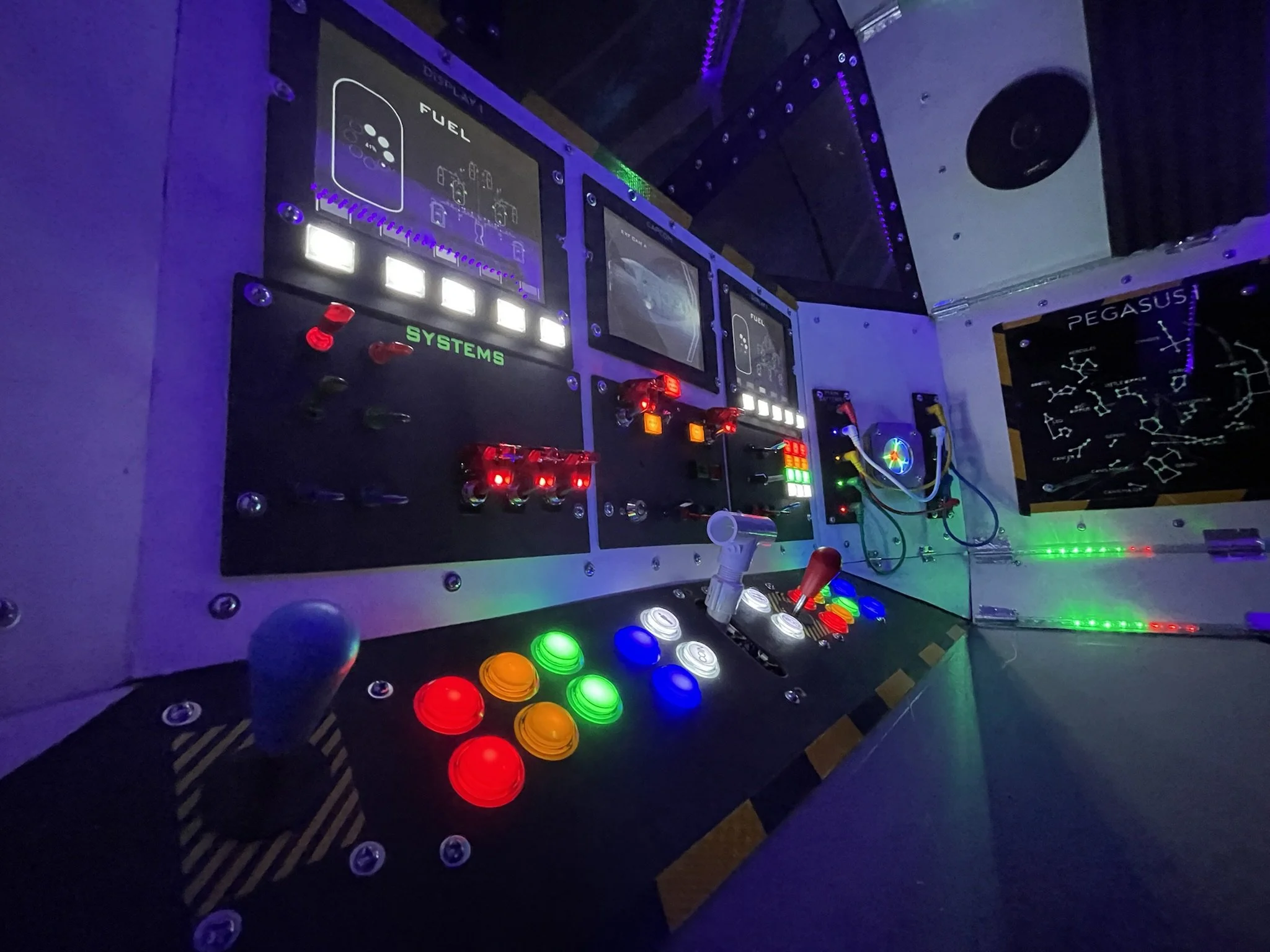 At first, I just wanted lights and switches that clicked and glowed. But when I stumbled across a Raspberry Pi setup loaded with (totally legitimate, definitely not bootleg) retro arcade games, the mission changed. With 3 relatively inexpensive 8” LCDs wired through an HDMI splitter, the ship became not only a cockpit but also a time machine into my own childhood.