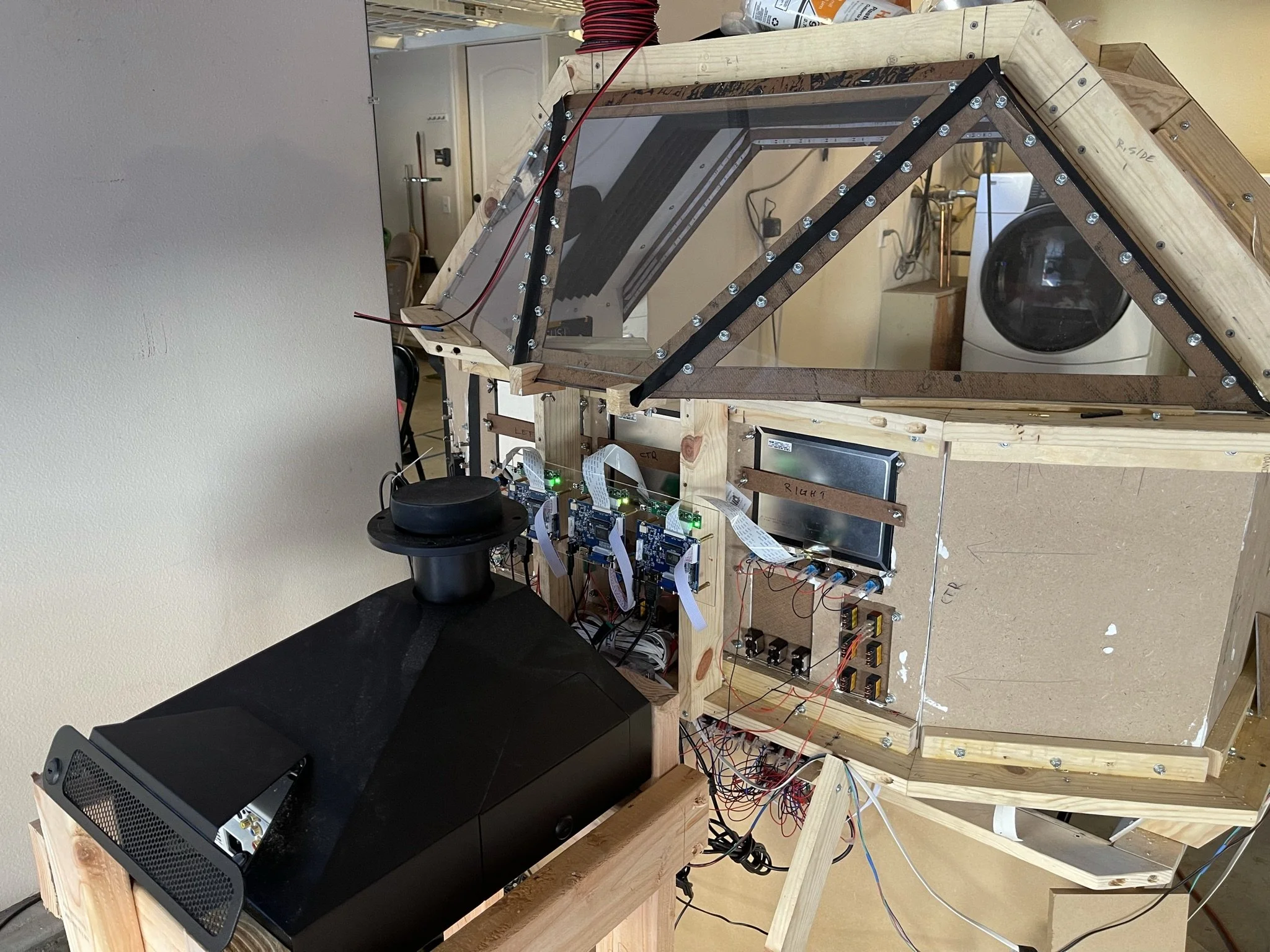 To complete the illusion, I added car speakers overhead, a bass shaker in the floor, and a ventilation system to keep the cabin comfortable in the summer months. For a brief and very short-lived experiment, I even connected a fog machine to the air system to simulate an emergency. One panic attack later, that feature was retired.